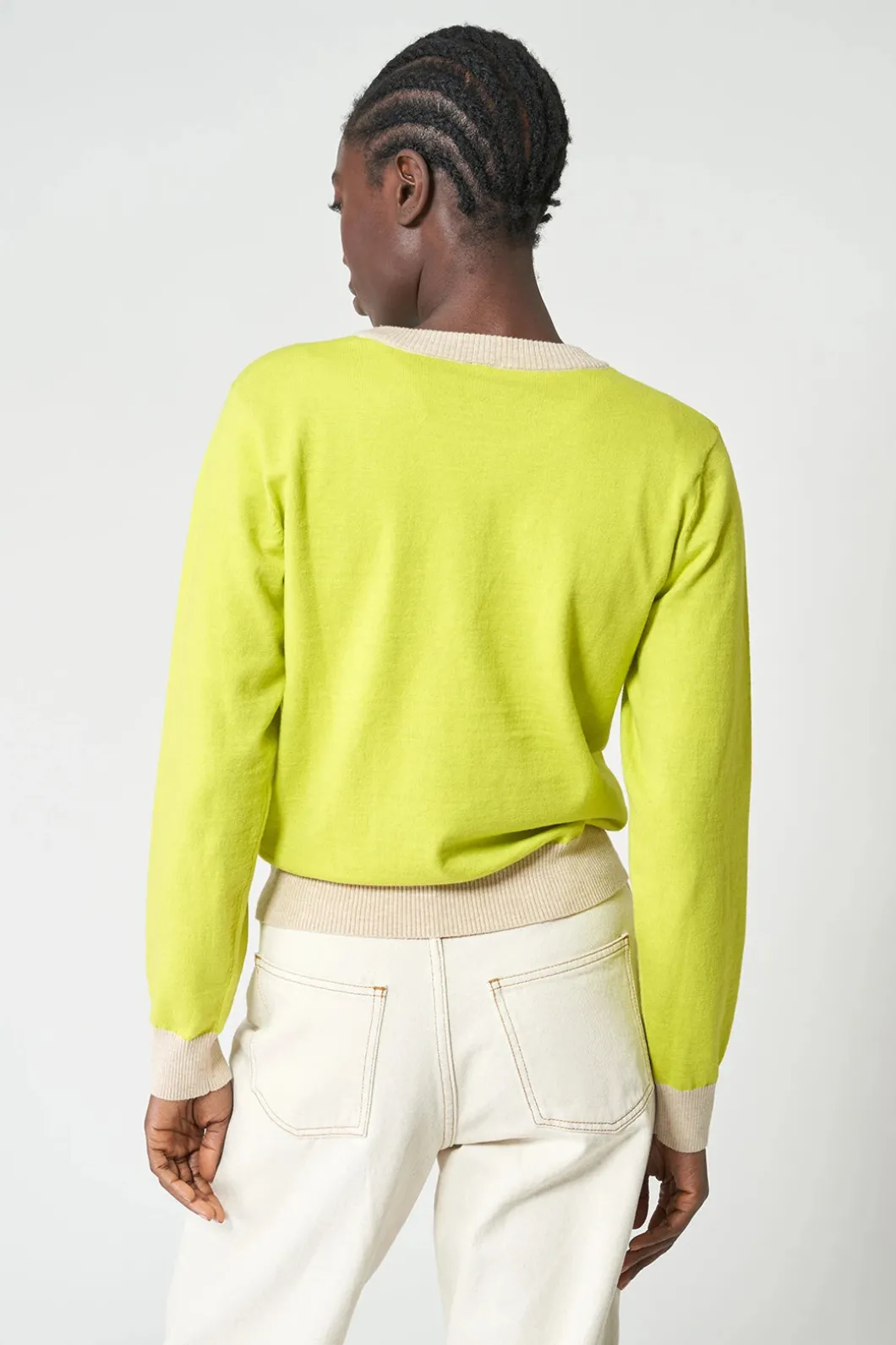 Confeccionado con una suave lana vegana, este jersey corto bicolor presenta cuello redondo, manga larga y los acabados en canalé a contraste. Un jersey desenfadado que combina a la perfección con unos vaqueros o unos joggers informales.