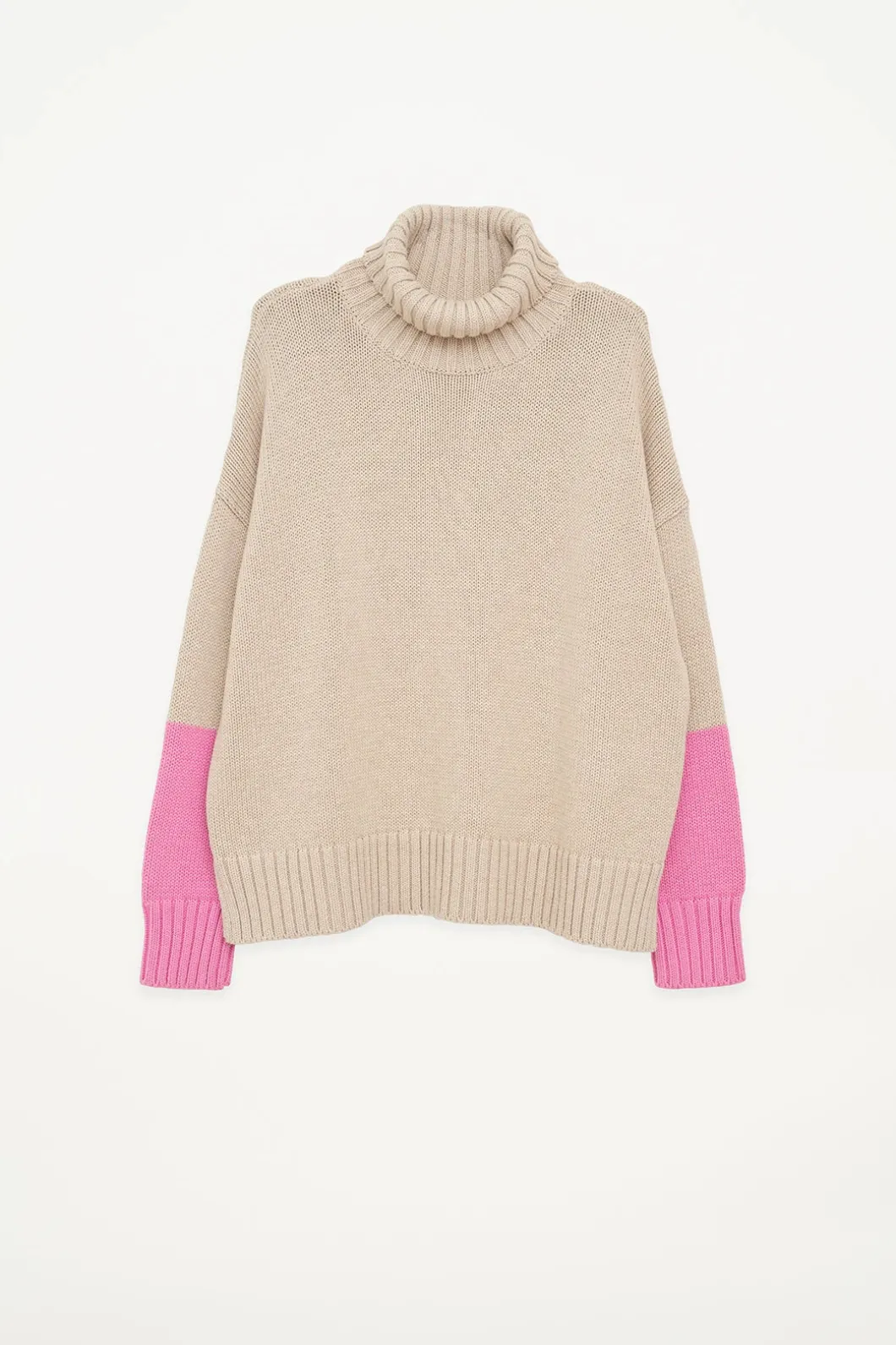 El jersey de cuello vuelto Hau está tejido con una lana vegana suave y cálida. Presenta media manga en contraste de color y el bajo tiene una abertura para acentuar la silueta. Este jersey tiene un corte amplio y los hombros caídos.