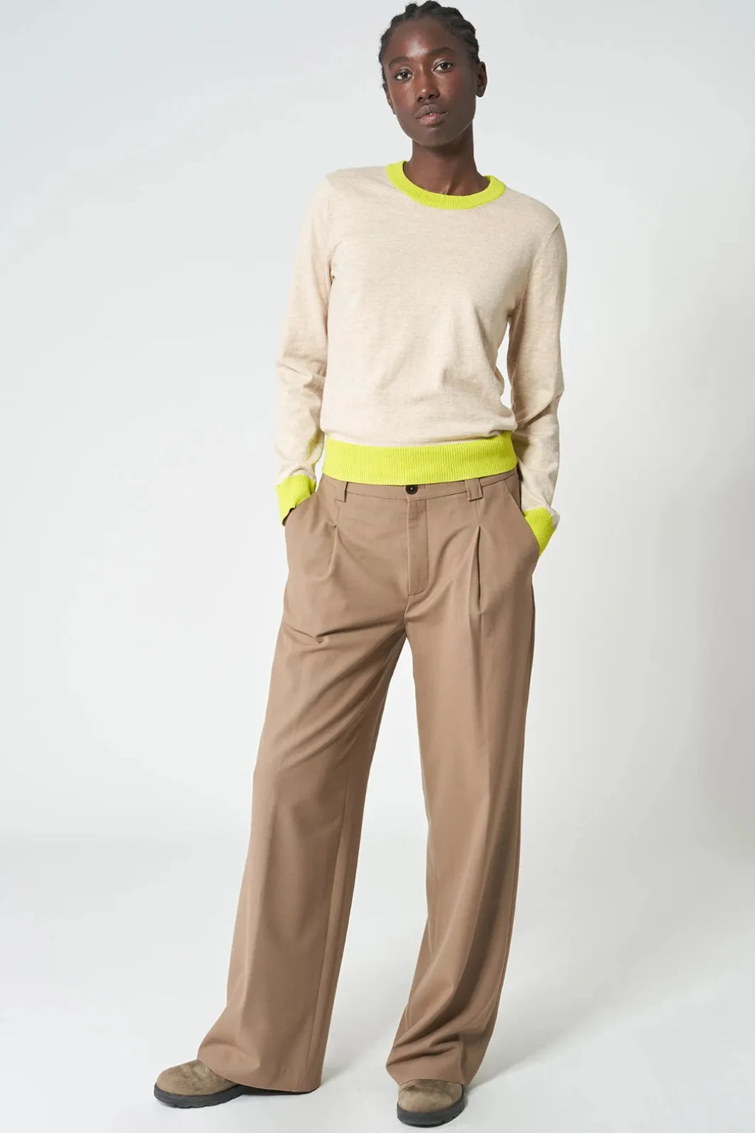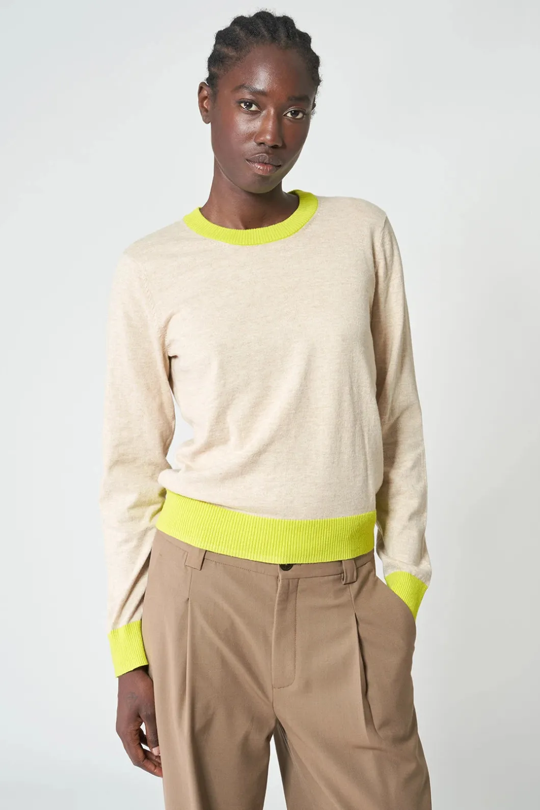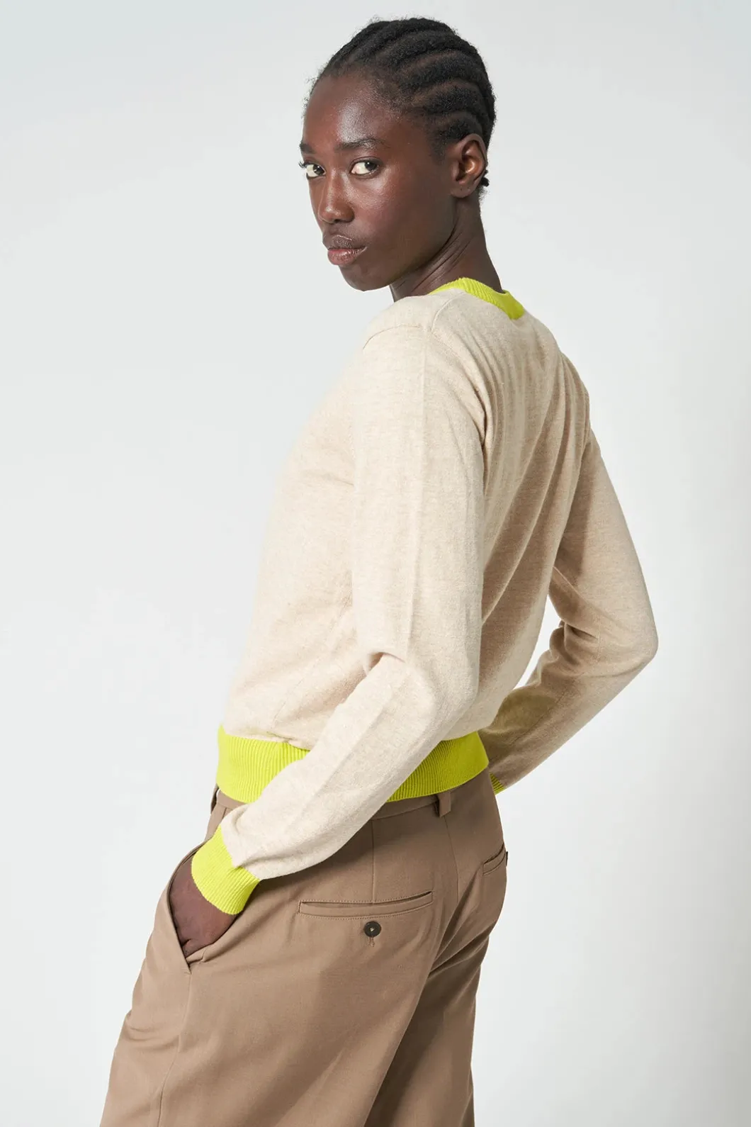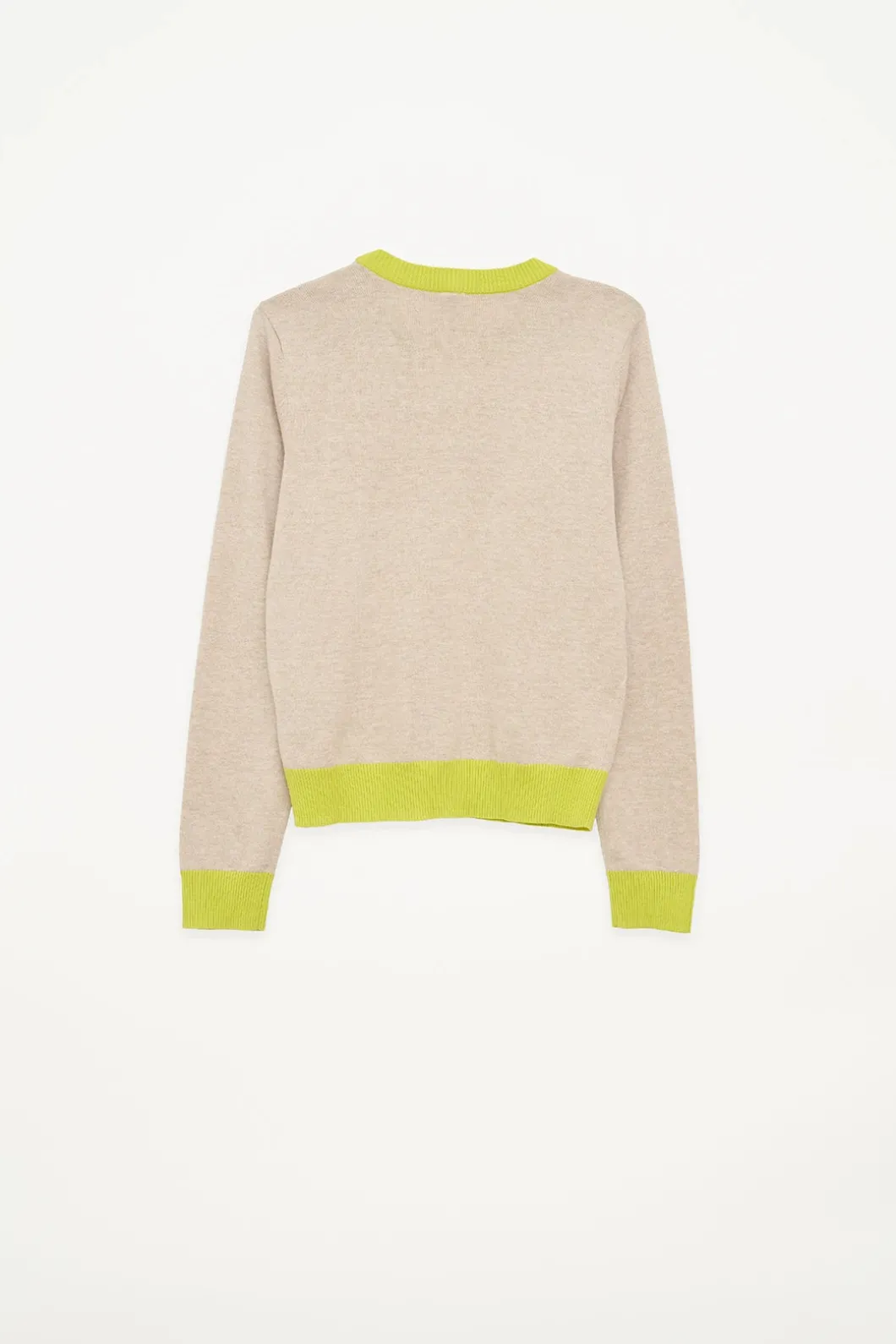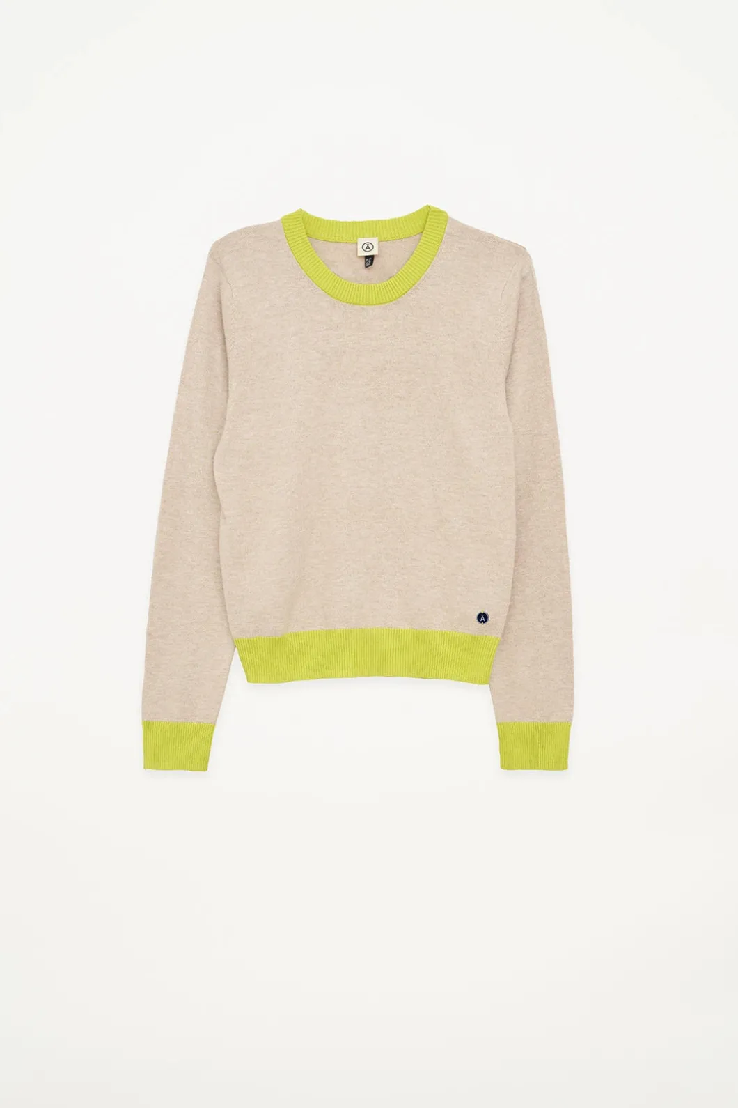 Confeccionado con una suave lana vegana, este jersey corto bicolor presenta cuello redondo, manga larga y los acabados en canalé a contraste. Un jersey desenfadado que combina a la perfección con unos vaqueros o unos joggers informales.