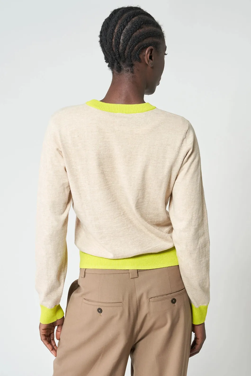 Confeccionado con una suave lana vegana, este jersey corto bicolor presenta cuello redondo, manga larga y los acabados e…