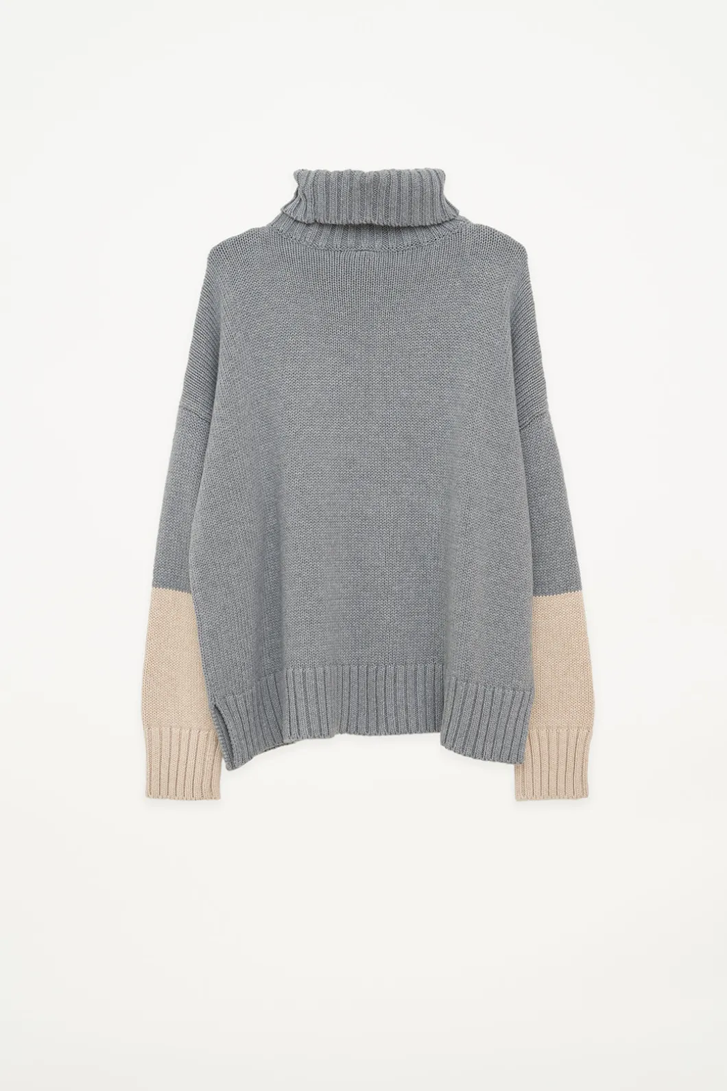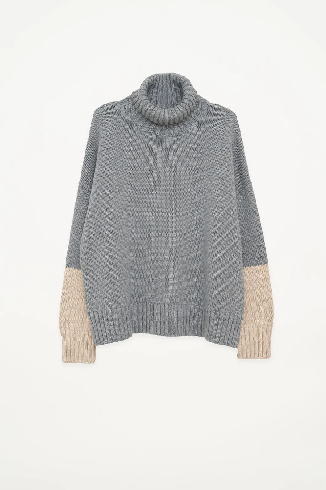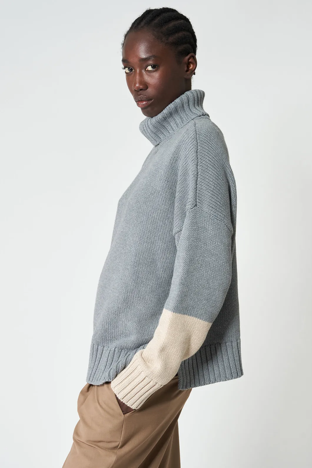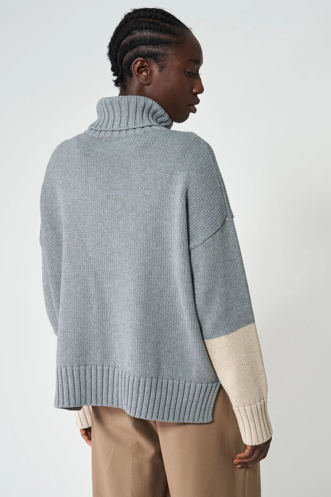 El jersey de cuello vuelto Hau está tejido con una lana vegana suave y cálida. Presenta media manga en contraste de color y el bajo tiene una abertura para acentuar la silueta. Este jersey tiene un corte amplio y los hombros caídos.