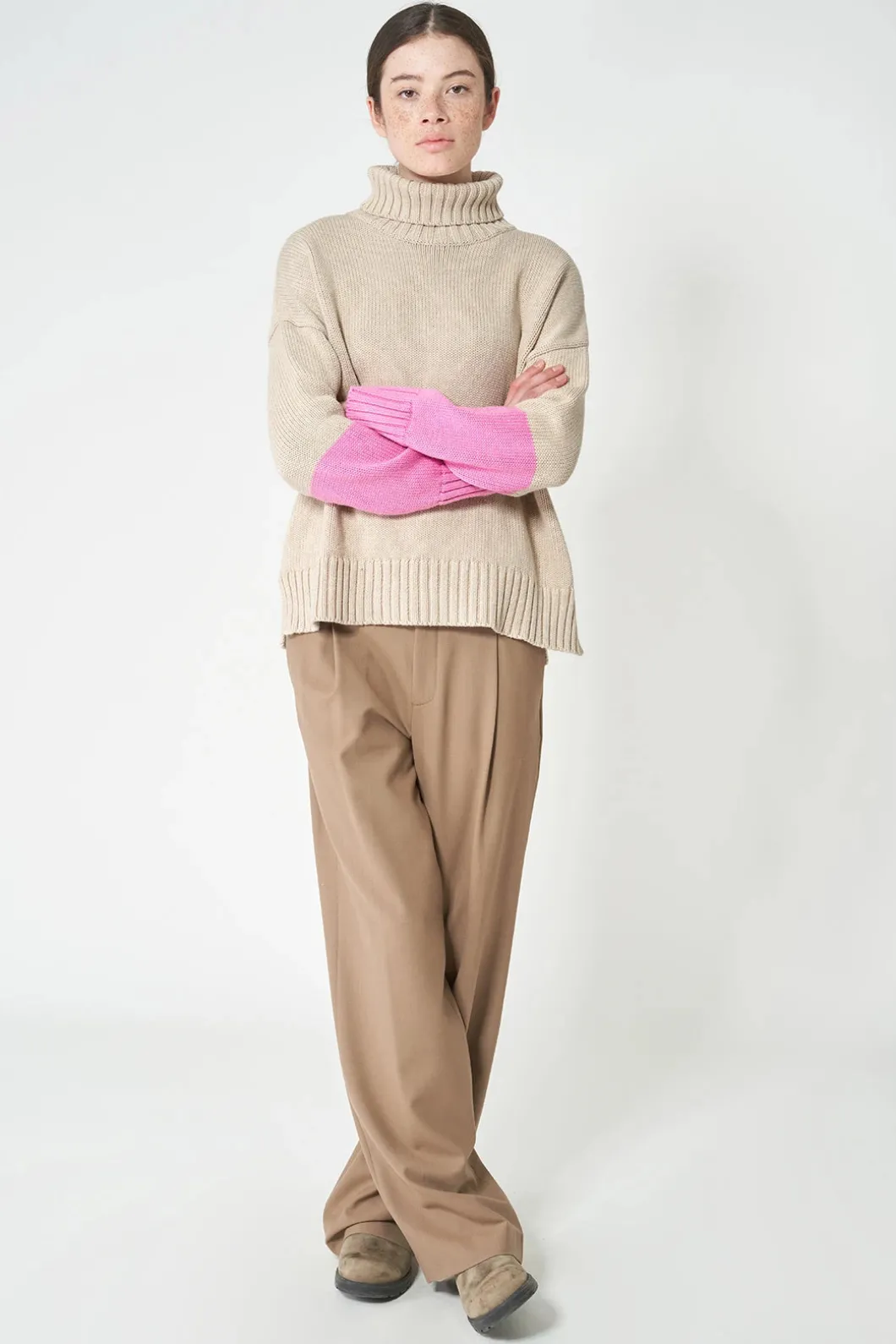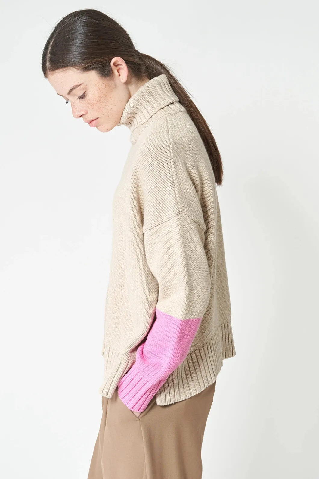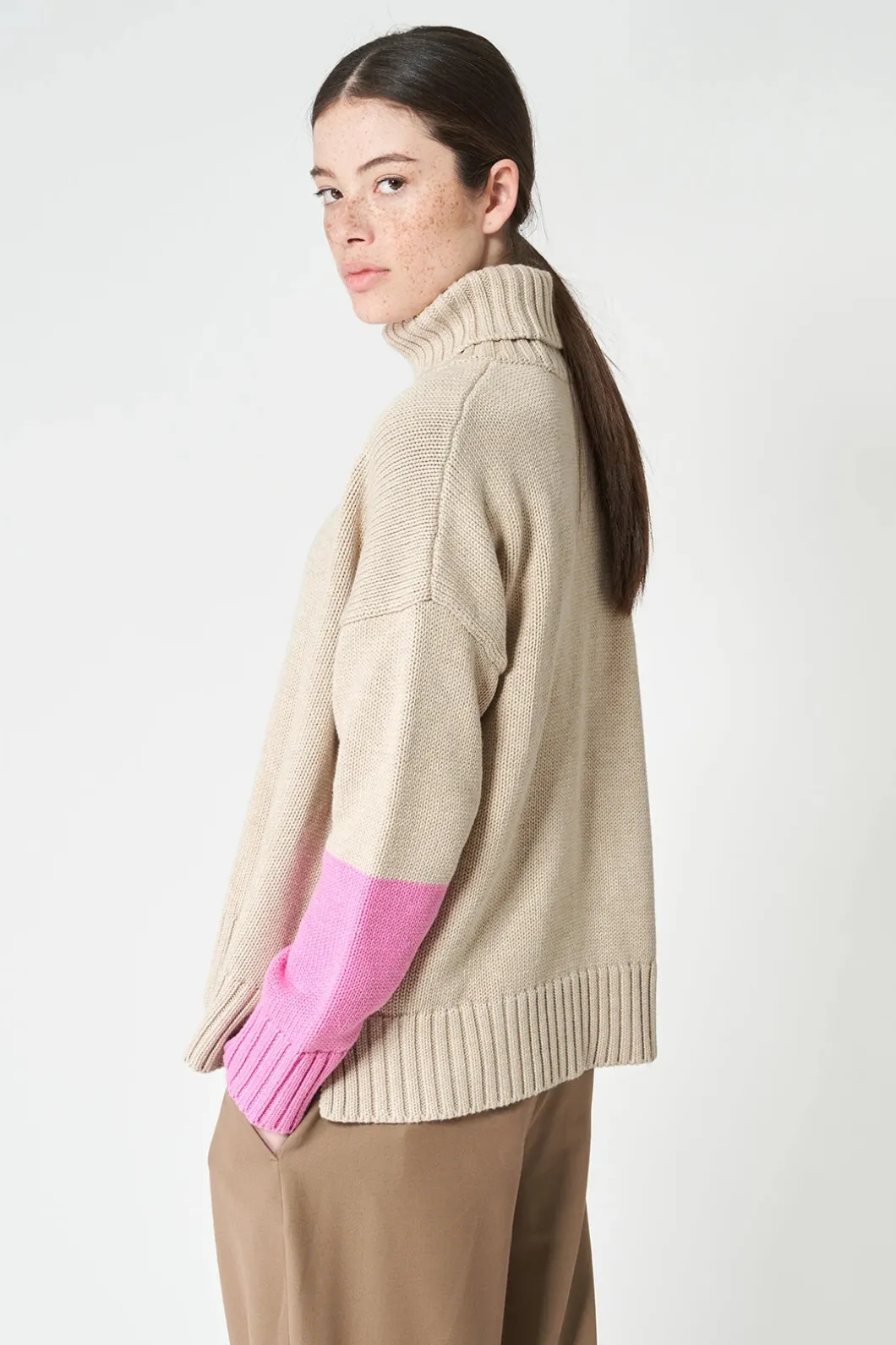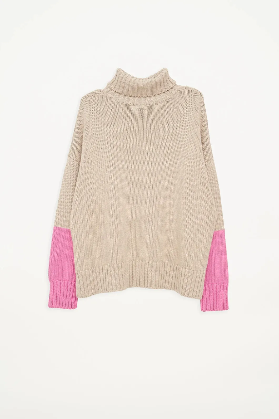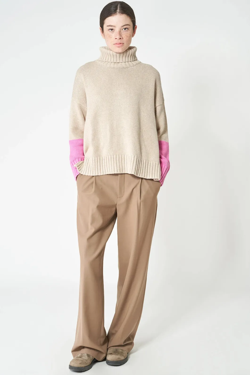 El jersey de cuello vuelto Hau está tejido con una lana vegana suave y cálida. Presenta media manga en contraste de color y el bajo tiene una abertura para acentuar la silueta. Este jersey tiene un corte amplio y los hombros caídos.