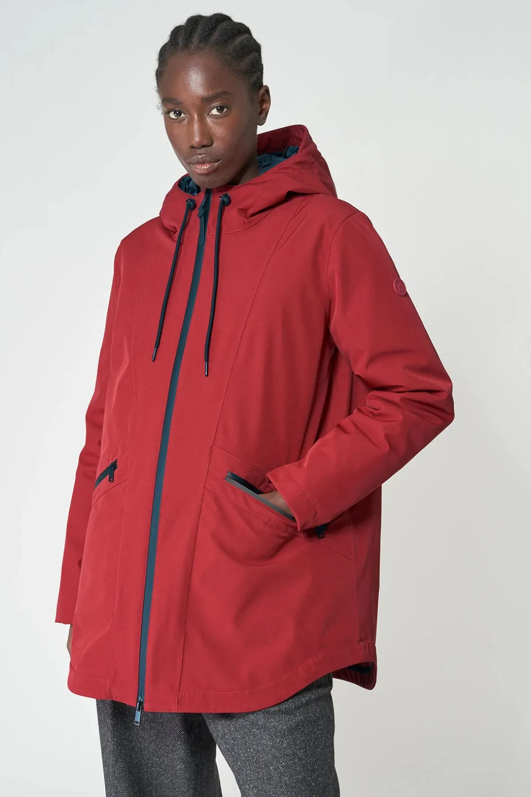 – Capucha con cordón y cuello alto.