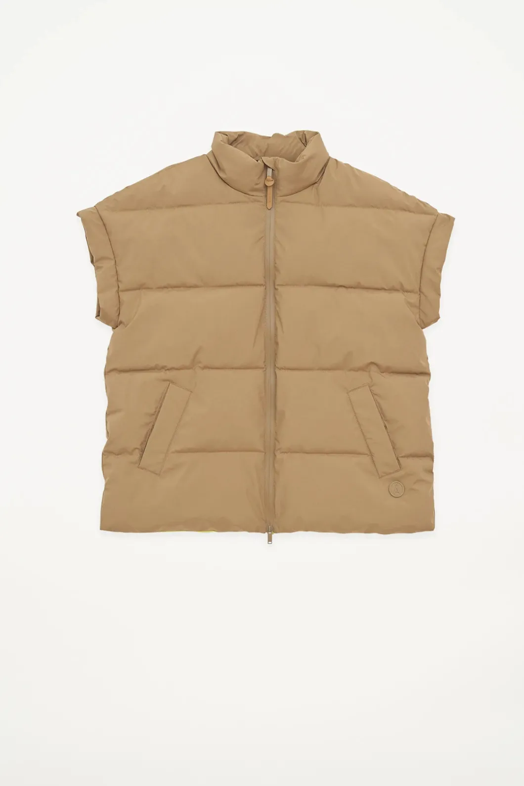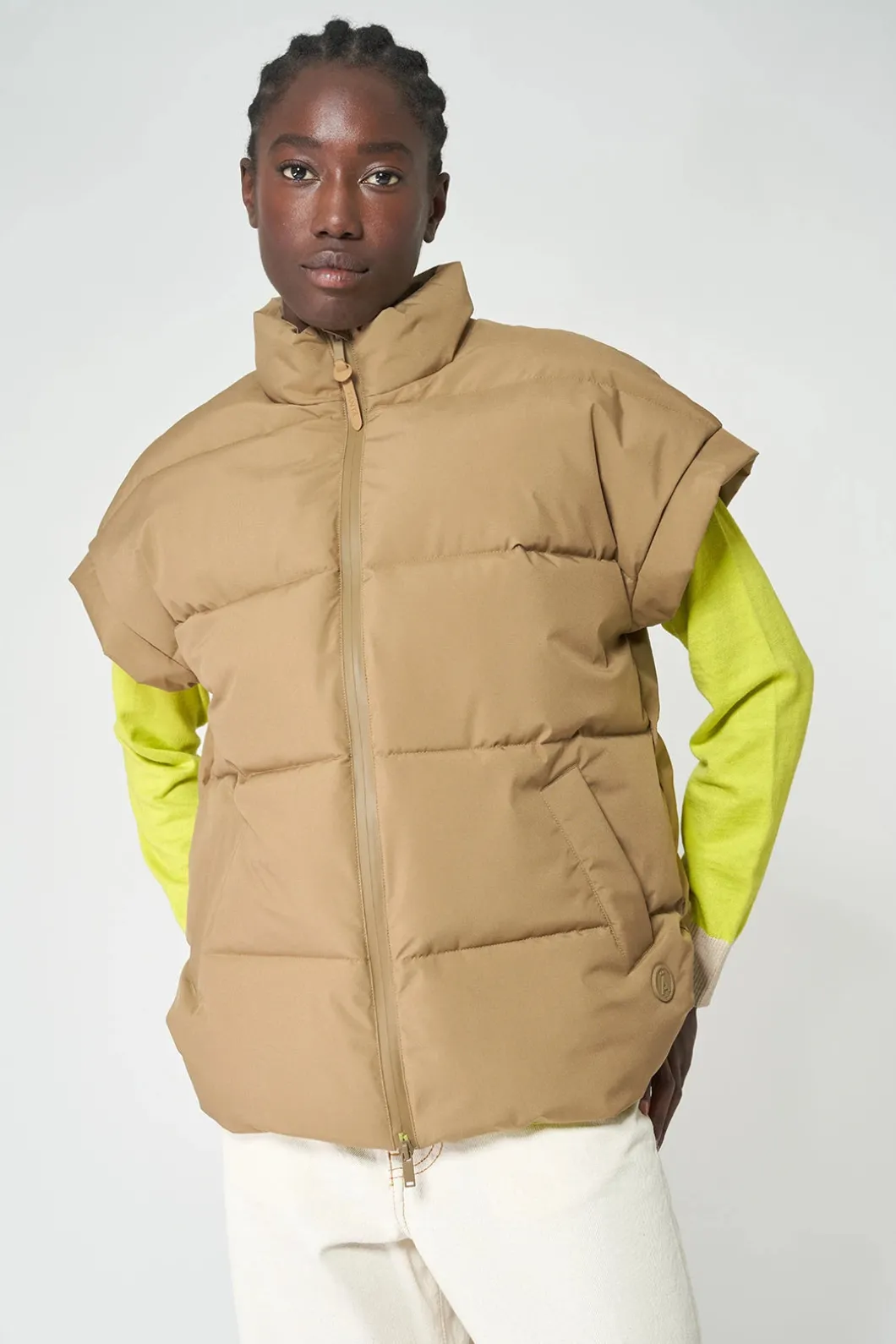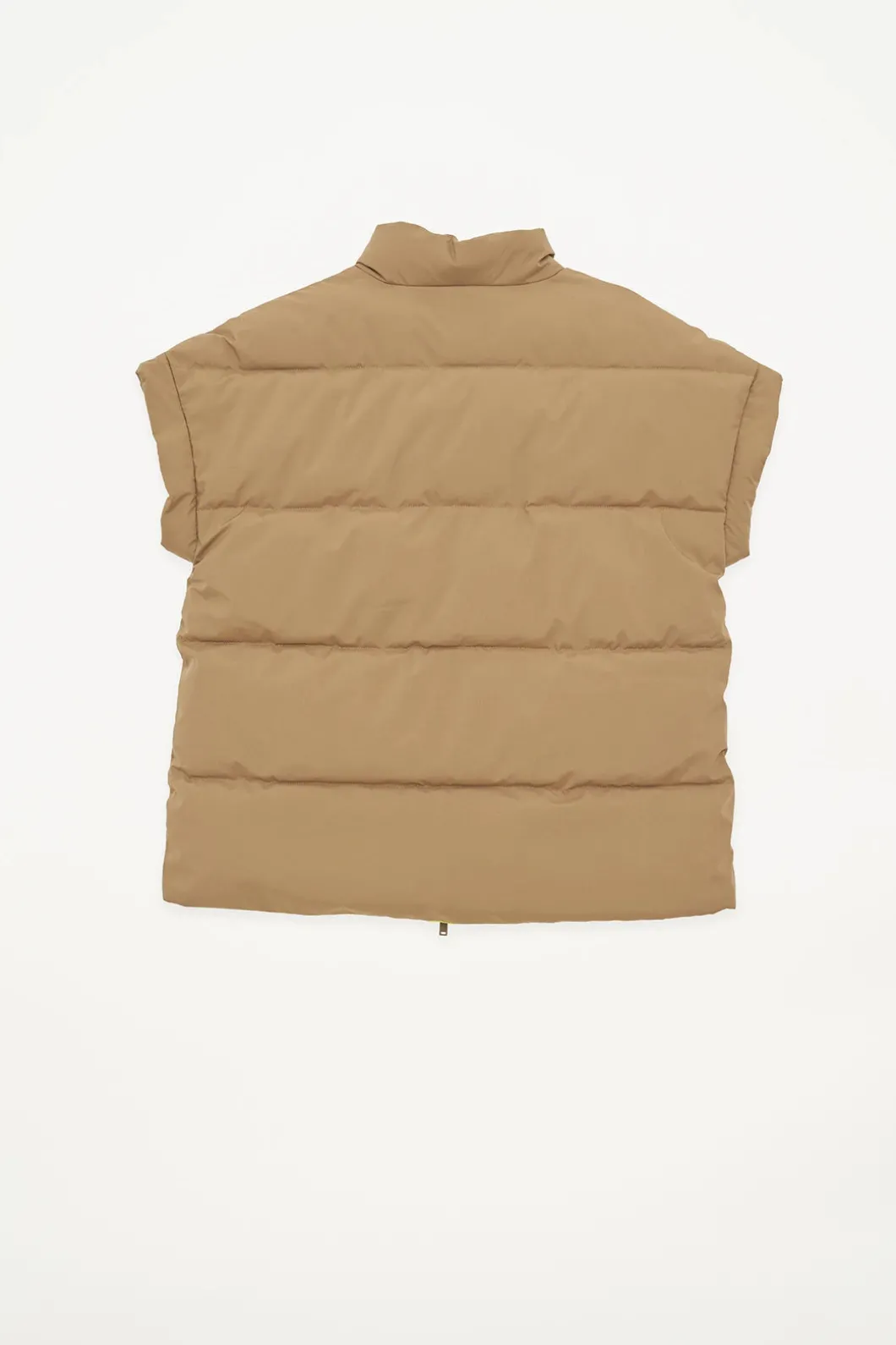 Chaleco impermeable acolchado repelente al agua de mujer confeccionado 100% en poliéster reciclado. Pozzanghera es una pieza clásica para ponerte sobre lo que quieras con una silueta holgada que presenta una cremallera frontal impermeable y cuello alto . Se ajusta a la talla real.