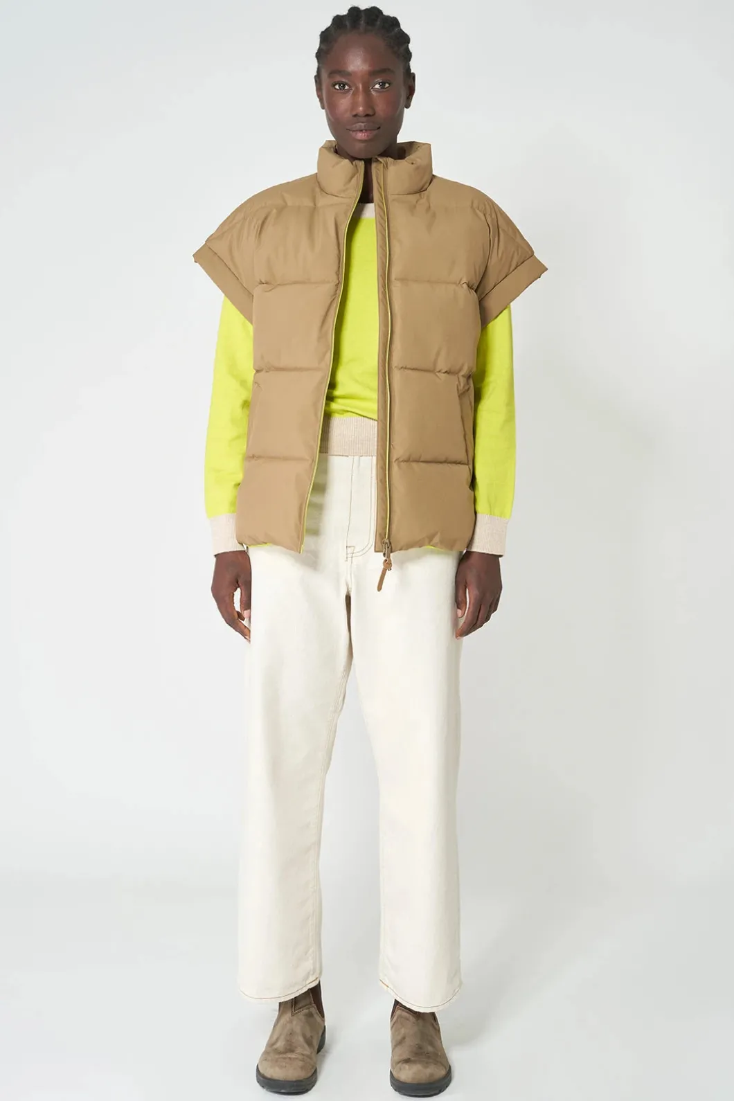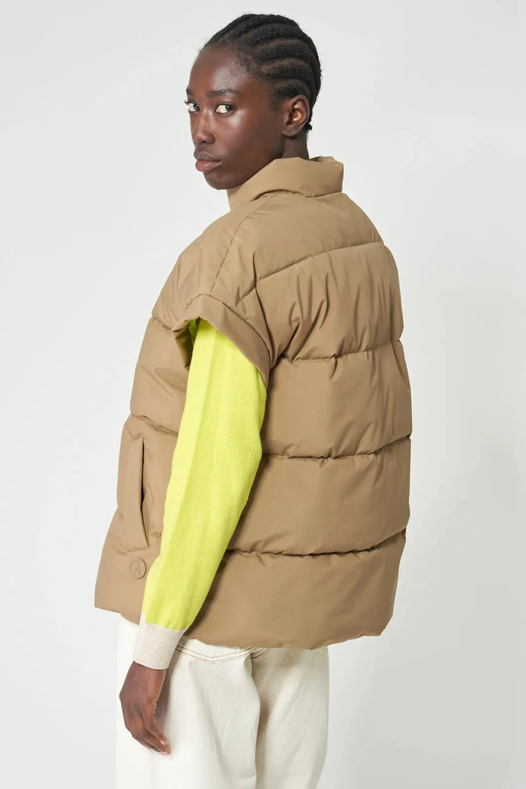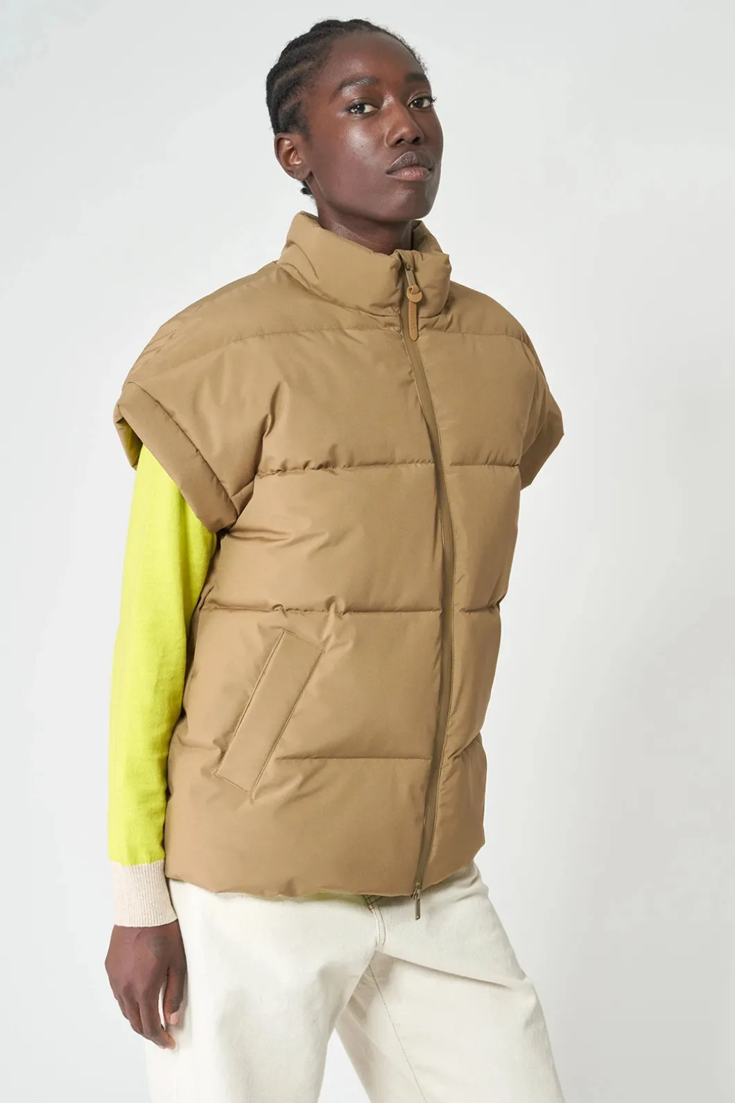 Chaleco impermeable acolchado repelente al agua de mujer confeccionado 100% en poliéster reciclado. Pozzanghera es una pieza clásica para ponerte sobre lo que quieras con una silueta holgada que presenta una cremallera frontal impermeable y cuello alto . Se ajusta a la talla real.