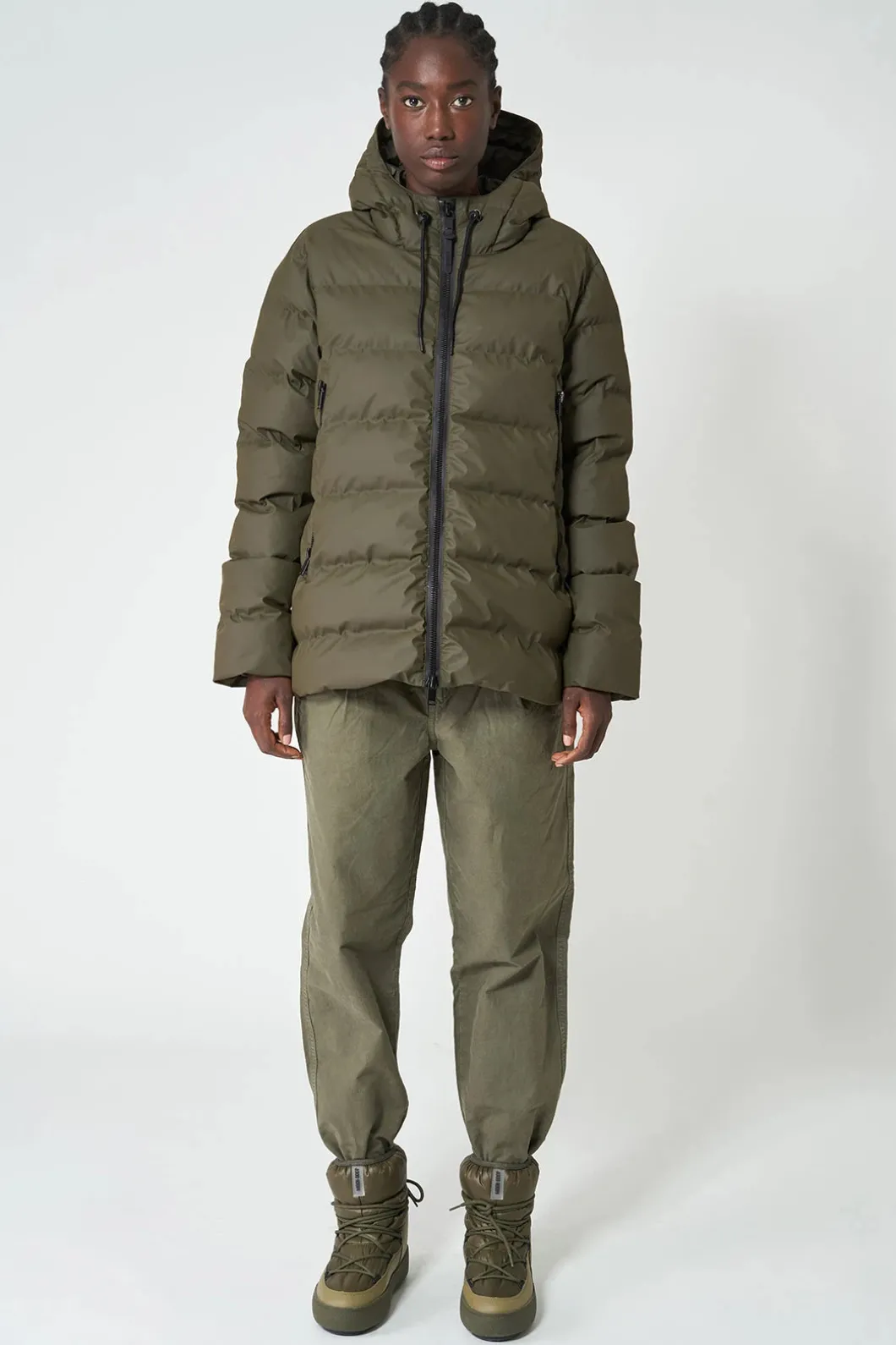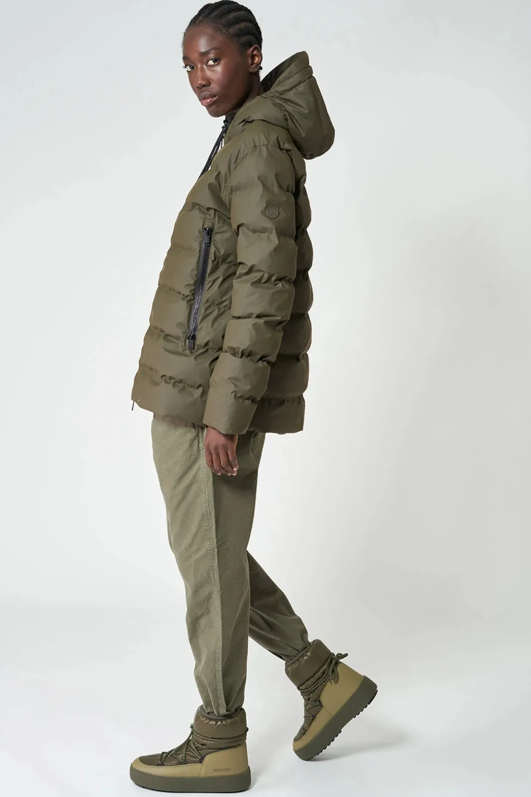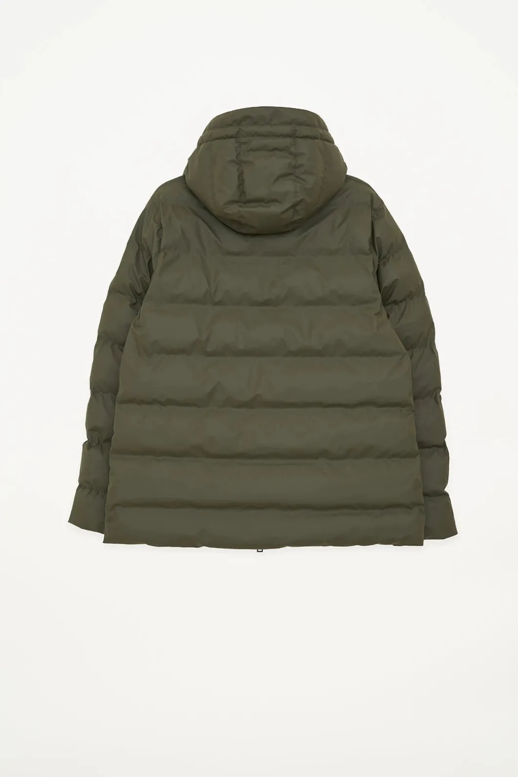 – Capucha con cordón y cuello alto.