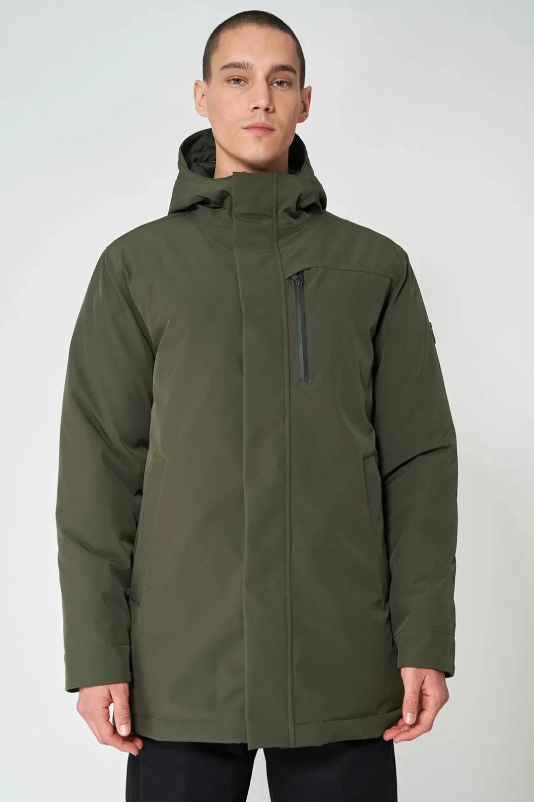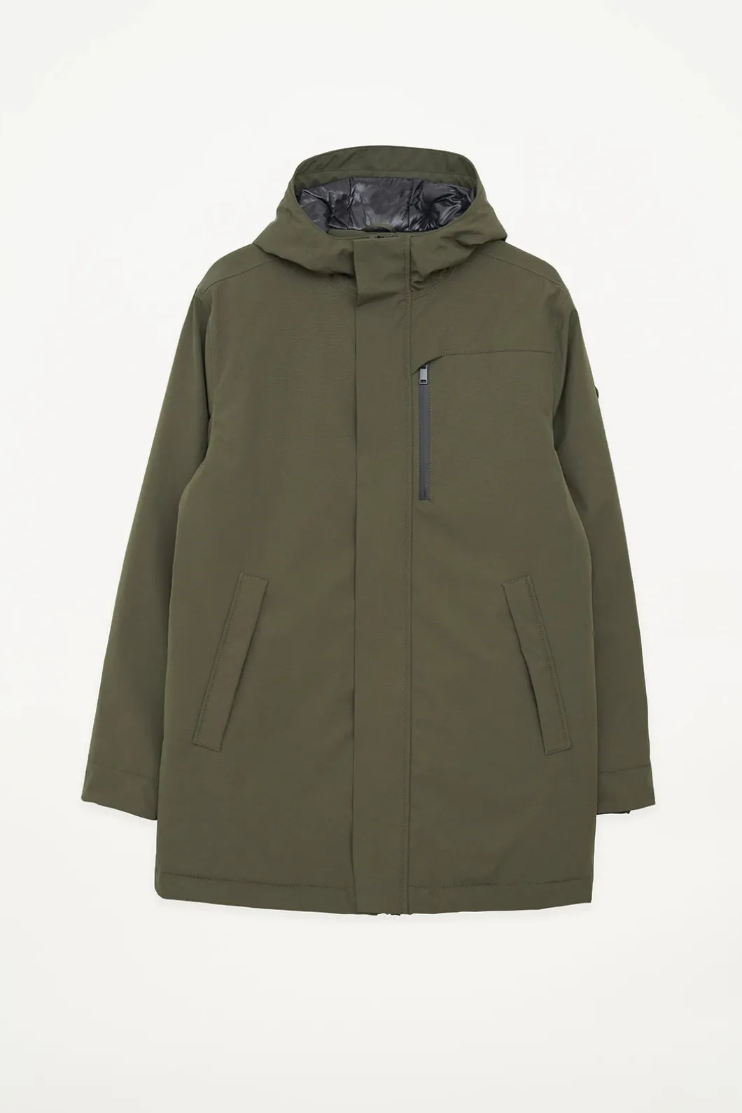 – Bolsillo en el pecho con cremallera impermeable y detalle para ocultar el tirador.
