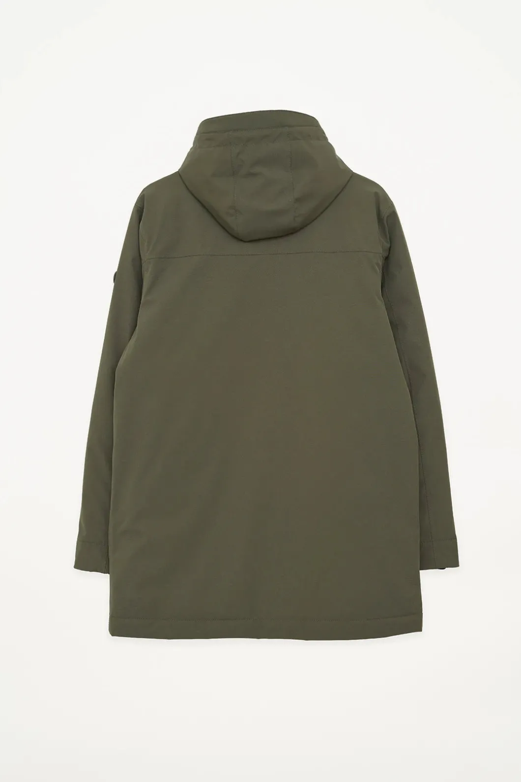 – Capucha con cordón de ajuste y cuello alto.