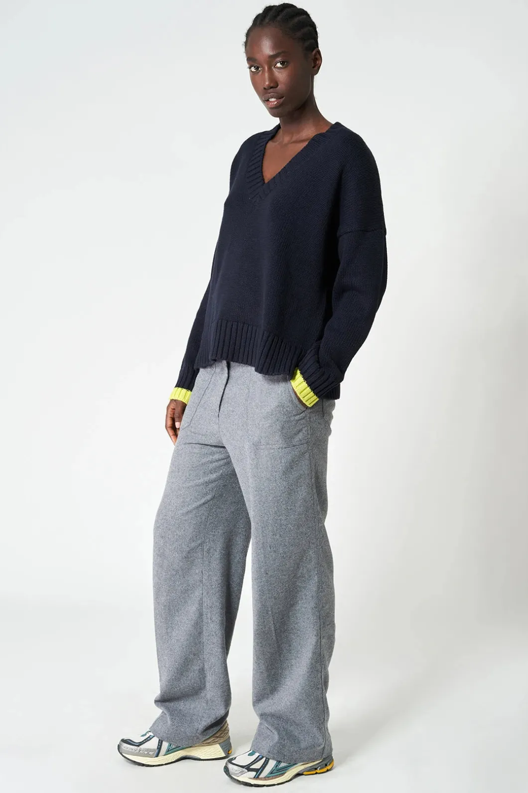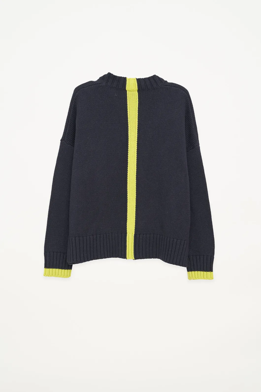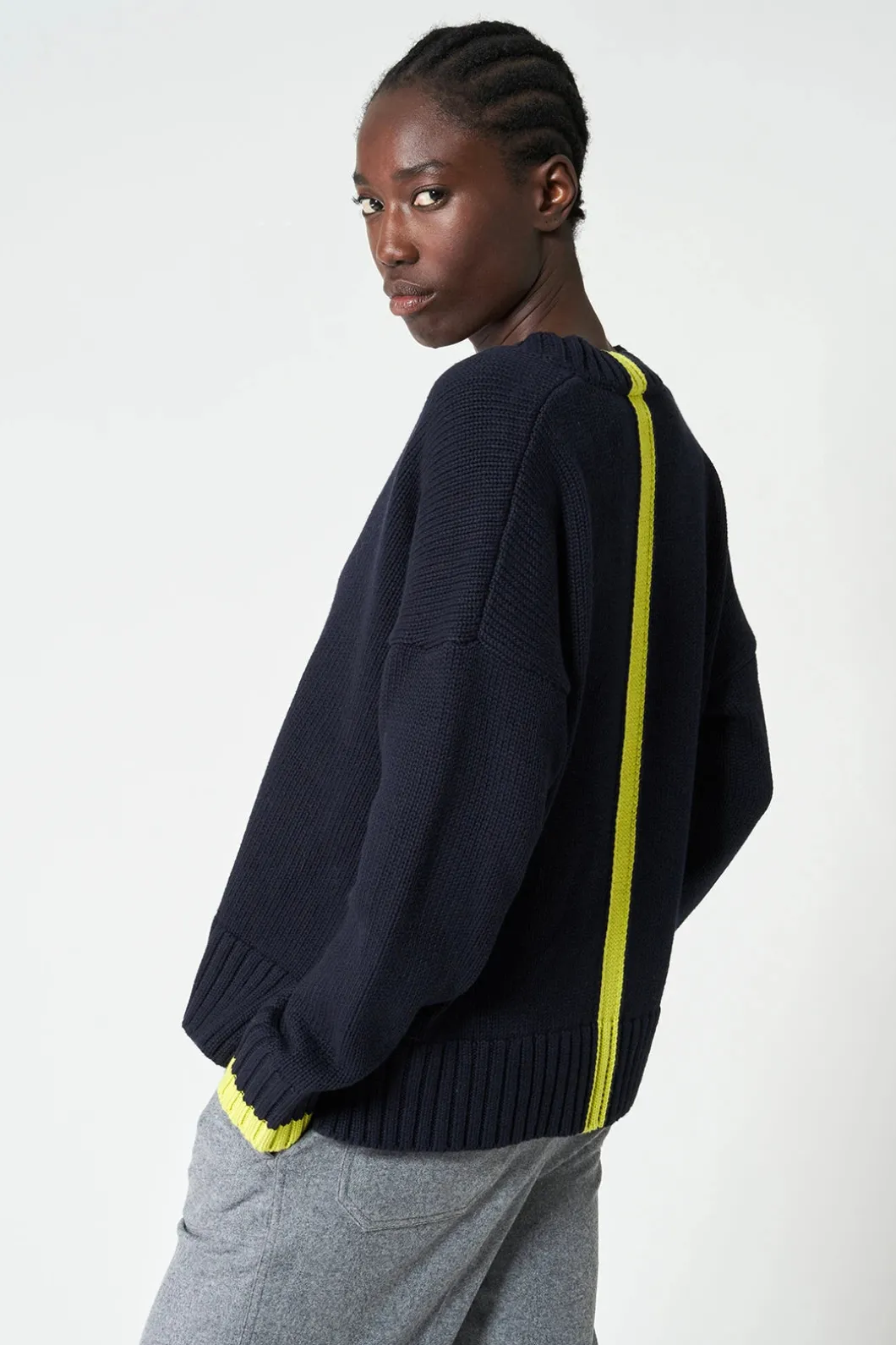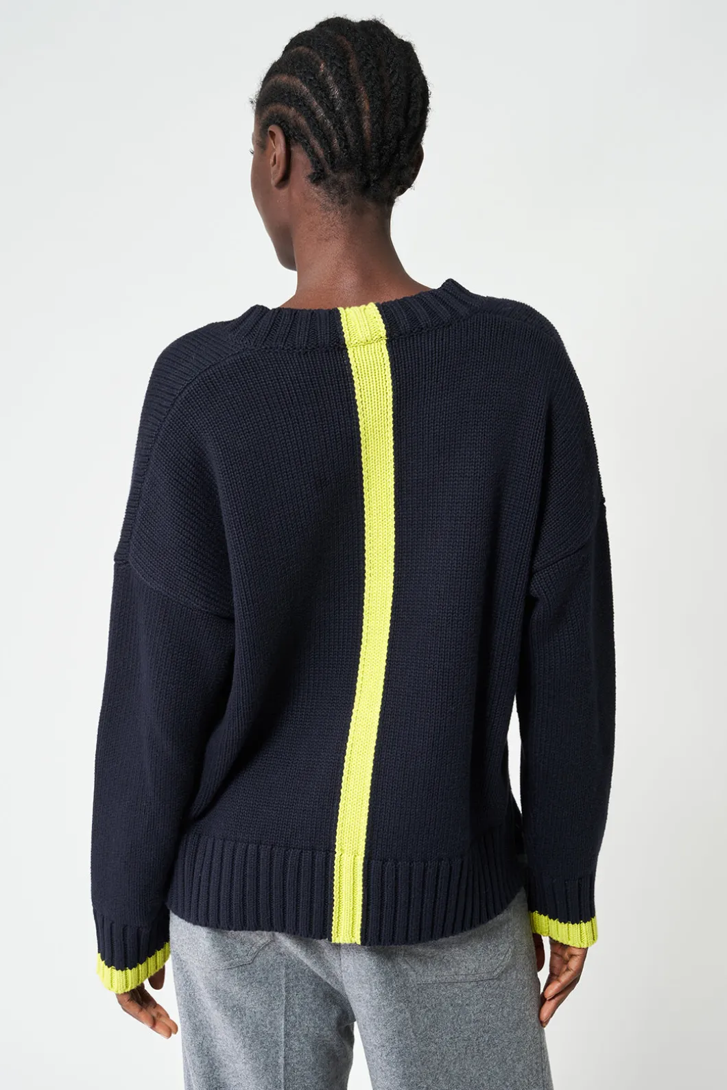 El jersey Berf está tejido con una suave lana vegana en diferentes tonos, creando una raya vertical a contraste en la espalda y el borde de los puños. Tiene una silueta relajada, escote pico y aberturas laterales en el bajo para acentuar el corte.
