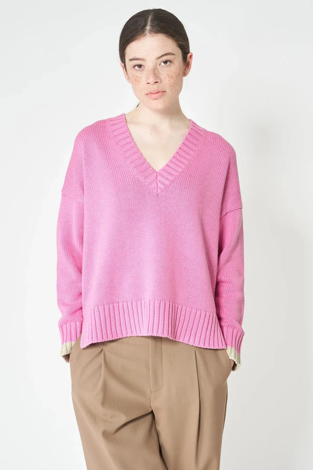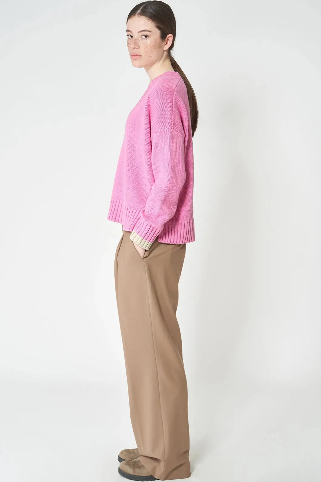 El jersey Berf está tejido con una suave lana vegana en diferentes tonos, creando una raya vertical a contraste en la espalda y el borde de los puños. Tiene una silueta relajada, escote pico y aberturas laterales en el bajo para acentuar el corte.