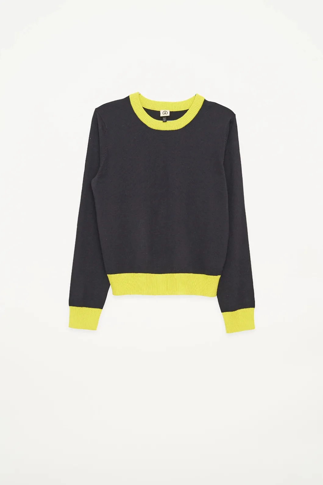 Confeccionado con una suave lana vegana, este jersey corto bicolor presenta cuello redondo, manga larga y los acabados e…