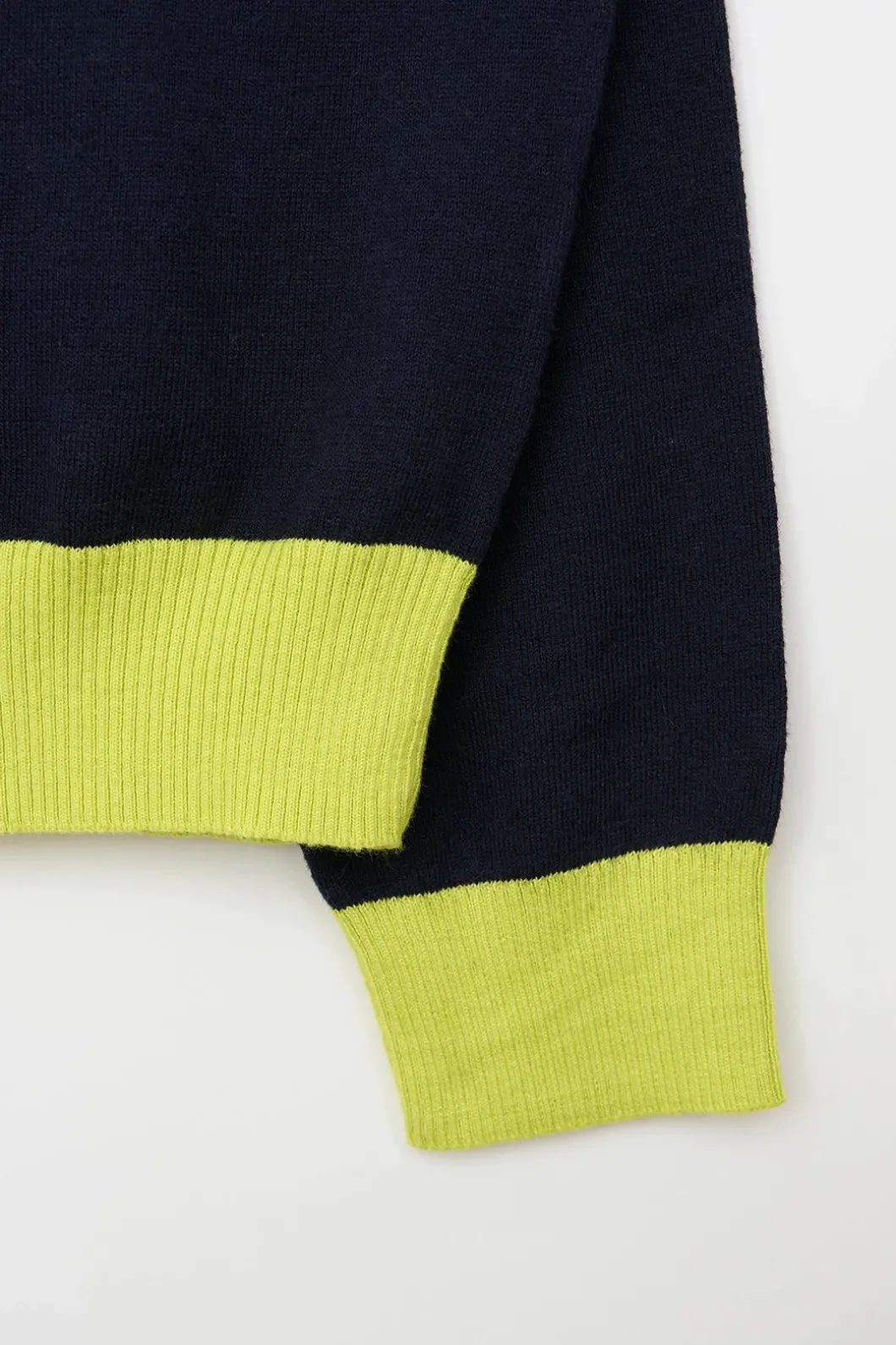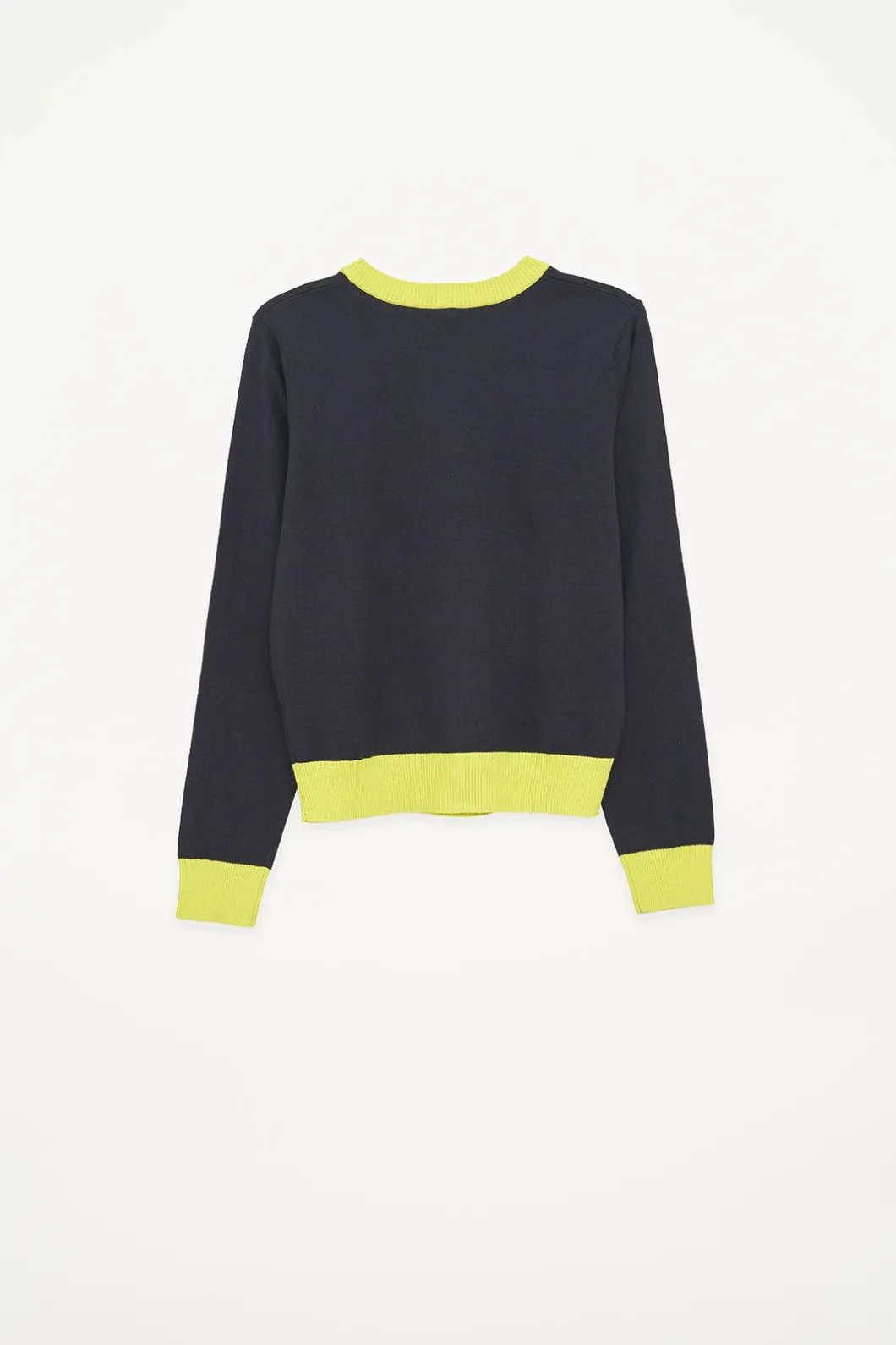 Confeccionado con una suave lana vegana, este jersey corto bicolor presenta cuello redondo, manga larga y los acabados en canalé a contraste. Un jersey desenfadado que combina a la perfección con unos vaqueros o unos joggers informales.
